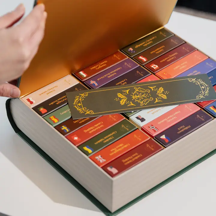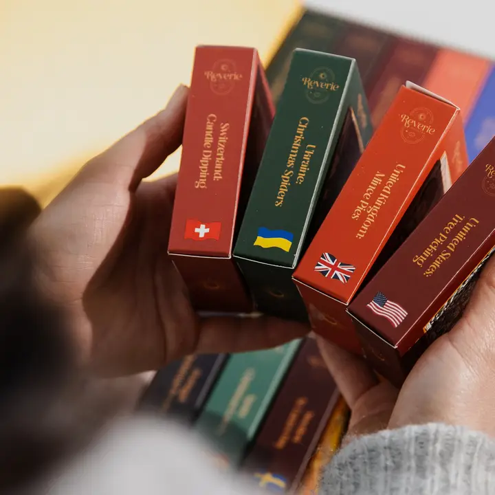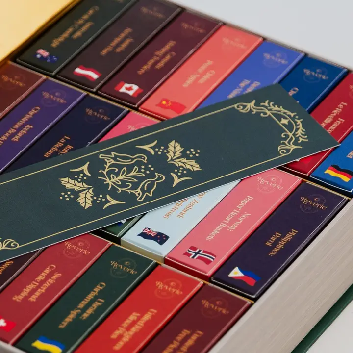 Les boîtes ne sont pas numérotées, mais ornées du drapeau de chaque pays, vous laissant libre de choisir l’ordre de découverte. Un marque-page recto-verso récapitulatif est inclus pour suivre votre progression tout au long du mois de décembre.