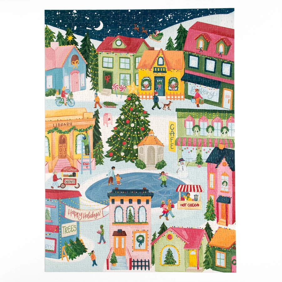 Redonnez vie à la magie des fêtes avec ce puzzle de 1000 pièces représentant un village de Noël peint à la main. La scène dépeint un paysage hivernal animé : lumières scintillantes, patineurs sur la glace et boutiques décorées pour la saison. Du marché de Noël animé à la place enneigée du village, chaque pièce reflète la joie et la convivialité de l’hiver.