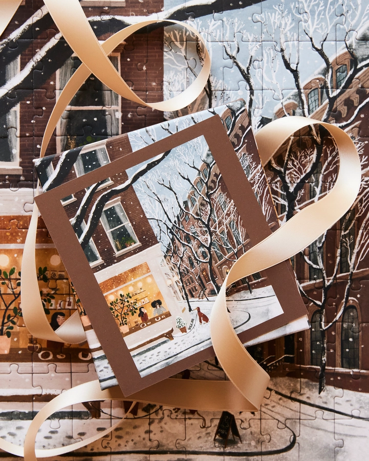 Offrez-vous une escapade new-yorkaise avec le puzzle Coffee in the West Village, illustré par Rachel Victoria Hillis. Ce mini puzzle de 100 pièces capture l’atmosphère chaleureuse d’un café du West Village lors d’une journée d’hiver enneigée. À travers la vitrine, on devine les conversations animées, les rires et la chaleur du café, tandis qu’à l’extérieur, un chien attend patiemment son propriétaire prêt à repartir pour une promenade dans Central Park.